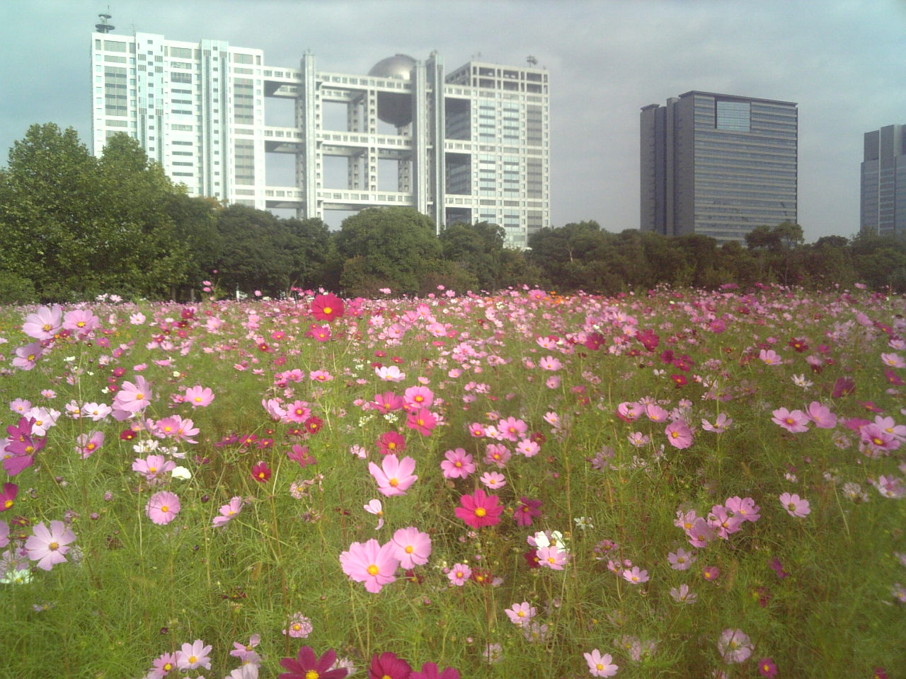 プロムナード公園というらしいですが、国際展示場駅からずーっと遊歩道が続いていて、フジテレビを横に見る辺りから、コスモスが満開に咲いています。